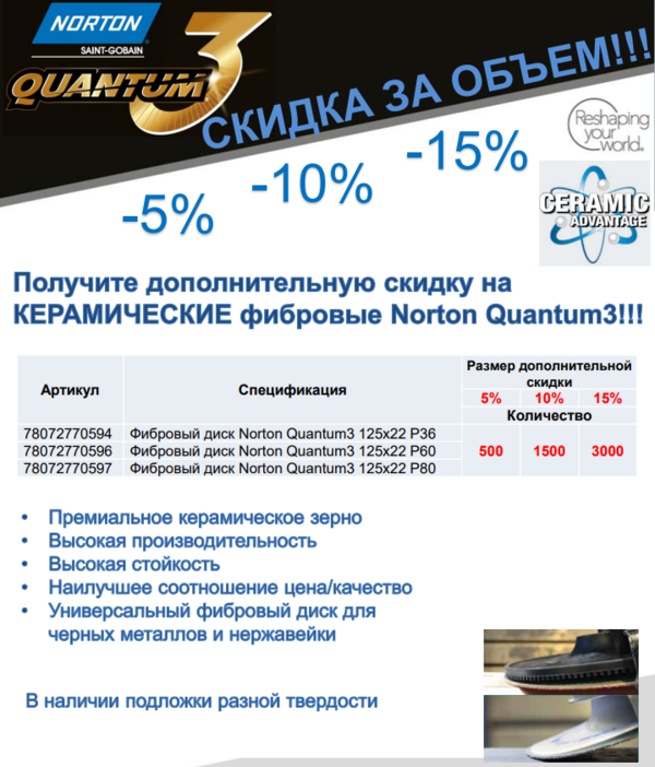 Скидки на фибровые диски Norton Quantum до 15%!